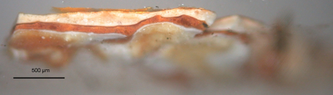 We have recently completed analysis of the Inigo Jones timber ceiling which supports the famous Ruben’s paintings in the Banqueting house. Through our research the primary scheme, the imitation walnut and gold scheme associated with installation of the Rubens paintings in 1638 were identified, along with subsequent restoration schemes including the repainting of the entire ceiling for Sir John Soane in the nineteenth century and the repainting fo the ceiling in off-white. The image below shows the primary white, 1638 gilding and 19th century gilding. The image directly below is a sample form gilding photographed at 50x magnification with scale bar. The final report can be accessed as a .pdf below.